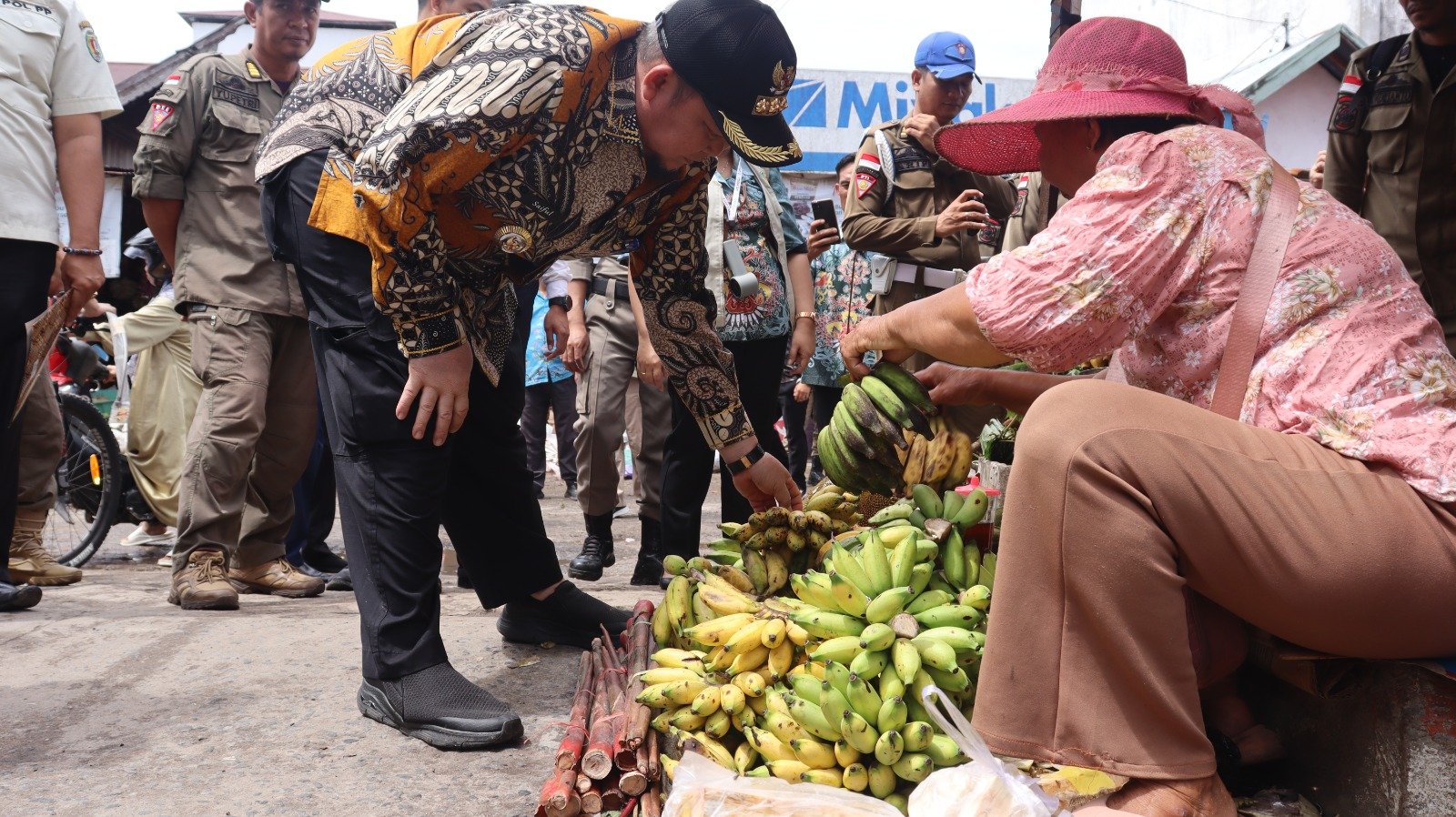 Bupati Katingan, Saiful berbincang dengan seorang penjual buah pisang di Pasar Tradisional Kasongan.