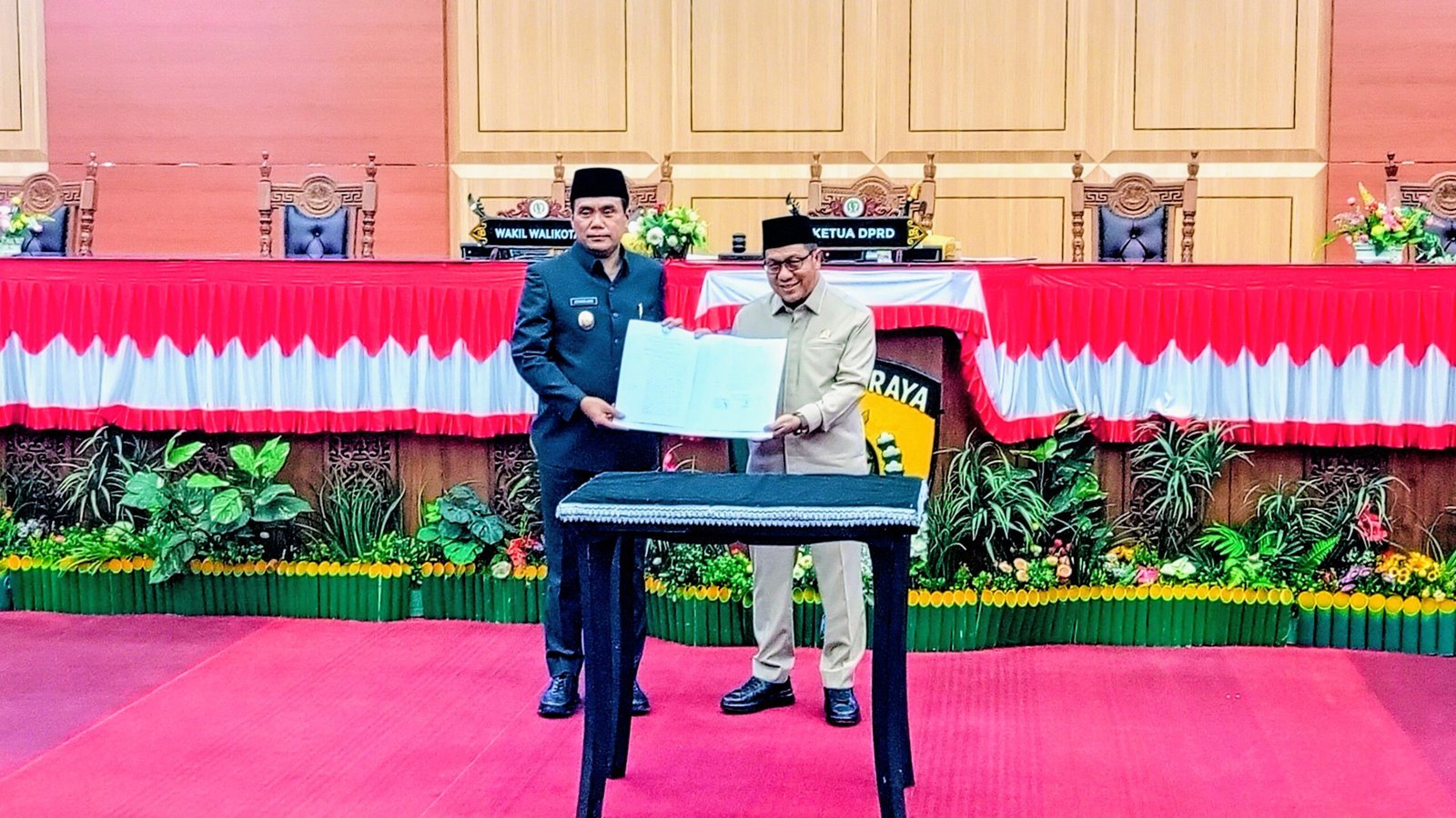 Usai penandatanganan keputusan dan berita acara, Ketua DPRD Kota Palangka Raya Subandi bersama Wakil Wali Kota Achmad Zaini, Rabu (22/4/2026).