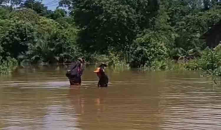 Warga menyeberangi genangan banjir di Desa Tumbang Mujam, Kecamatan Tualan Hulu, Kotim, Jumat (5/12/2025). Foto Istimewa