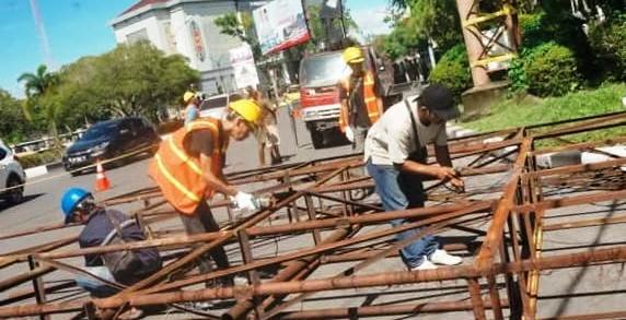 PENERTIBAN – Tim Pemerintah Kota Palangka Raya melakukan penertiban terhadap spanduk dan reklame, yang tidak sesuai aturan. Foto : Istimewa