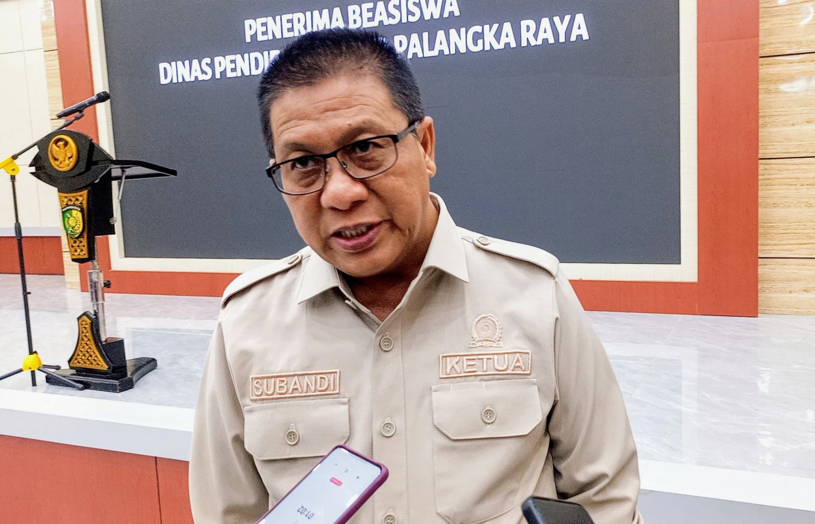Ketua DPRD Kota Palangka Raya, Subandi, saat diwawancarai usai menghadiri launching beasiswa, lomba kampung keren, dan peresmian Aula Dinas Pendidikan Kota Palangka Raya di Aula Hapakat Jaya, Kamis (2/4/2026).